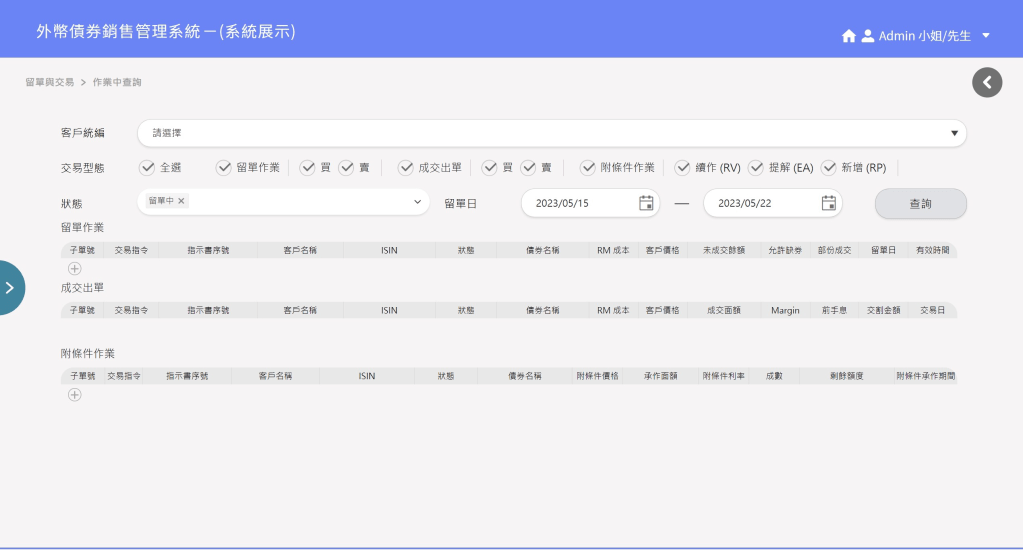- 完整交易生命週期控管-產品發行、申購、交易、Fixing/配息、到期、Rollover 、 Unwind提解、Callback作業